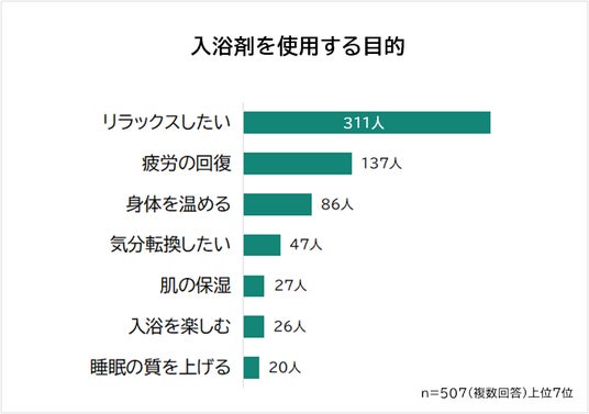 入浴剤を使用する目的の圧倒的1位は「リラックスしたい(311人)」で、6割以上の人から回答を集めました。2位「疲労の回復(137人)」、3位「身体を温める(86人)」が続きます。