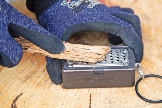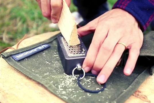 公園で拾ってきた小枝で火口(着火剤)を作っている様子。刃は一見普通の小型おろし金に見えますが、火口(ほくち)として理想の形状になるよう、計算と試作を重ねた結果、刃の数、厚み、角度などが最適に設計されています。