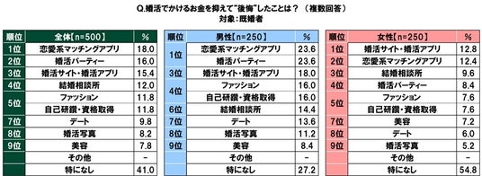 - 婚活でかけているお金を抑えたいと思うこと 男性1位は「恋愛系マッチングアプリ」、女性1位は「婚活パーティー」