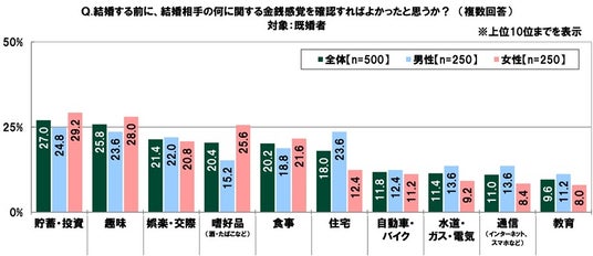 既婚者(500名)に、結婚する前に、結婚相手の何に関する金銭感覚を確認すればよかったと思うか聞いたところ、「貯蓄・投資」(27.0%)が最も高くなりました。次いで高くなったのは、「趣味」(25.8%)、「娯楽・交際」(21.4%)、「嗜好品(酒・たばこなど)」(20.4%)、「食事」(20.2%)でした。