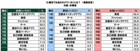 - 婚活でお金をかけていること 男性1位は「恋愛系マッチングアプリ」、女性1位は「美容」