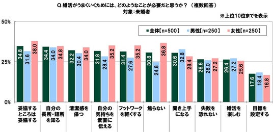 未婚者(500名)の回答をみると、「妥協するところは妥協する」(34.8%)が最も高くなり、「自分の長所・短所を知る」(34.4%)、「清潔感を保つ」(32.2%)、「自分の気持ちを素直に伝える」(31.8%)、「フットワークを軽くする」(31.4%)が続きました。