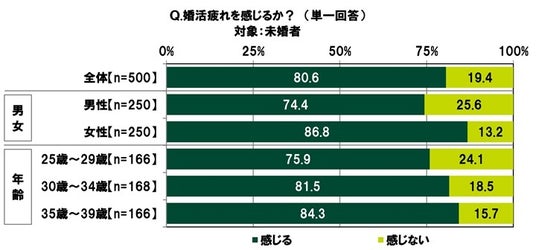 - 「婚活疲れを感じる」婚活を行っている未婚者の80.6%、女性では86.8%