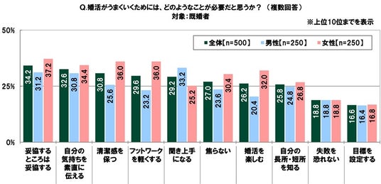 既婚者(500名)の回答をみると、「妥協するところは妥協する」(34.2%)が最も高くなり、「自分の気持ちを素直に伝える」(32.6%)、「清潔感を保つ」(30.8%)、「フットワークを軽くする」(29.6%)、「聞き上手になる」(29.2%)が続きました。