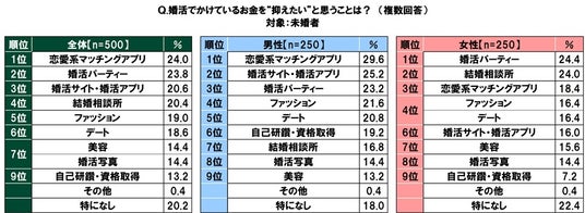 婚活でかけているお金を“抑えたい”と思うことを聞いたところ、1位「恋愛系マッチングアプリ」(24.0%)、2位「婚活パーティー」(23.8%)、3位「婚活サイト・婚活アプリ」(20.6%)、4位「結婚相談所」(20.4%)、5位「ファッション」(19.0%)となりました。