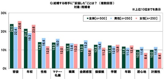 既婚者(500名)に、結婚する相手に“妥協した”ことを聞いたところ、「容姿」(24.0%)が最も高くなり、「年収」(21.4%)、「性格」(14.2%)、「マナー・礼儀」(14.0%)、「職業」(13.4%)が続きました。