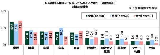 結婚する相手に対して“妥協してもよい”ことを聞いたところ、「学歴」(40.2%)が最も高くなり、「職業」(23.8%)、「年齢」(23.6%)、「年収」(22.4%)、「容姿」(21.8%)が続きました。