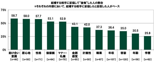妥協した内容別に、後悔したと回答した人の割合をみると、「助け合い意識」(58.7%)、「居心地」(58.0%)、「性格」(57.7%)、「価値観」(53.1%)、「マナー・礼儀」(52.9%)では半数を超えました。