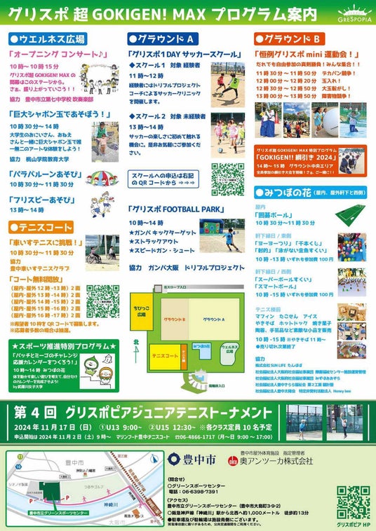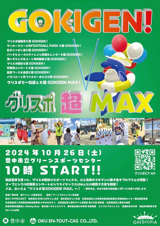 豊中市は、市屋外体育施設指定管理者である奥アンツーカ株式会社と共催で、秋のスポーツフェスタ「グリスポ超GOKIGEN ! MAX」をグリーンスポーツセンターで開催します。