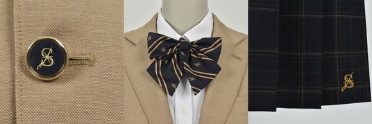 スクールカラーの黄色とマッチするさわやかなベージュのジャケットは、若々しさがありながらも、ボトムスに落ち着いたネービーベースの柄を合わせることで「安心感」や「安定感」を与えます。