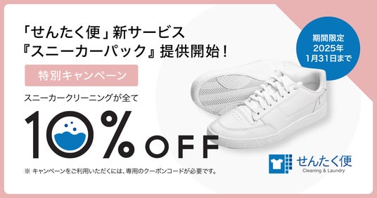 「スニーカーパック」の提供開始に伴い、本年12月20日(金)から2025年1月31日(金)までに「スニーカーパック」をお申込みいただいたお客様を対象とした、10%オフの期間限定キャンペーンを実施いたします。(キャンペーンをご利用いただくには、専用のクーポンコードが必要です。詳細はhttps://www.sentakubin.co.jp/sneaker/をご覧ください。)