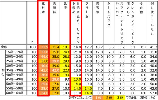 - 化粧水は男性の3人に1人以上が使用しているのに対し、日焼け止めは使用者はその半分以下
