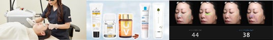 (写真左から)レーザーは1mm大で5,500円/飲む・塗る日焼け止め各種/シミの数や肌年齢を測定し効果検証