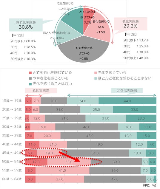 - 50代前半で老化実感する割合が、40代後半の2倍近くに急増(28%→50%)
