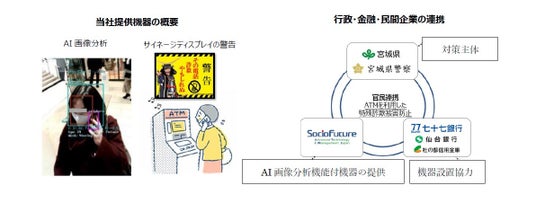 SocioFuture株式会社(東京都港区、代表取締役社長執行役員 COO 菅原 彰彦/以下 当社)と日本ATMビジネスサービス株式会社(東京都港区、代表取締役社長 斉藤 達哉)は、宮城県警察(宮城県仙台市、本部長 細田 正)および株式会社七十七銀行(宮城県仙台市、代表取締役頭取 小林 英文)、株式会社仙台銀行(宮城県仙台市、代表取締役頭取 坂爪 敏雄)、杜の都信用金庫(宮城県仙台市、理事長 星 倫市)の3行庫と連携し、AIによる画像分析を活用した特殊詐欺被害防止対策の取り組みを本年9月から開始したことをお知らせいたします。