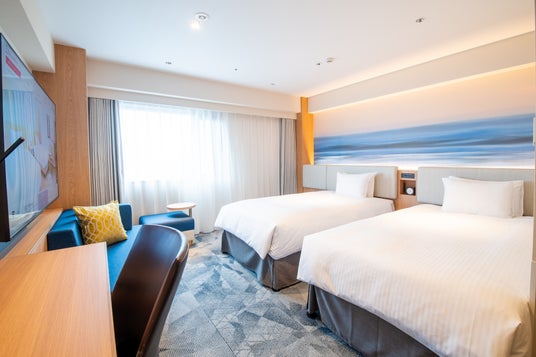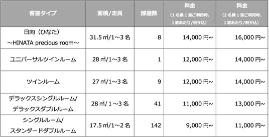 客室タイプはシングルルーム/スタンダードダブルルーム、デラックスシングルルーム/デラックスダブルルーム、ツインルーム、ユニバーサルツインルーム、日向(ひなた)~HINATA precious room~の5タイプ。今回のリニューアルでは、ビジネスで利用のお客さまには仕事に集中できる快適なワークスペースとゆっくりお休みいただける休息空間を提供し、観光やスポーツ観戦などレジャーで利用のお客さまには3名同室でご滞在いただける客室をご用意いたしました。