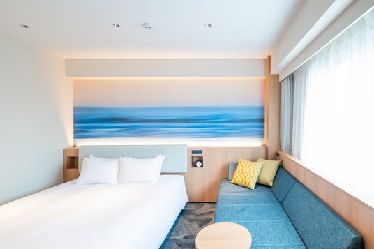 日南市は宮崎県南部に位置する海に面した地域で、青く美しい海と緑豊かな自然が広がっています。海と温暖な気候、そして神秘的な雰囲気をイメージしたファブリックや壁紙を取り入れた空間となっております。客室のデスク上に有線LANポート、デスクライトを設置。書類やノートPCを広げても余裕のあるワークスペースを確保しております。またベッドを追加し最大3名でご宿泊いただけます。