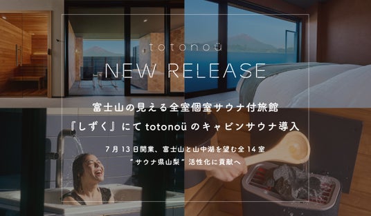 totonou Japan株式会社(本社:東京都渋谷区、代表:齋藤アレックス剛太、以下「totonoü(ととのう)」)は、山梨県南都留郡にて開業した『富士山の見える全室個室サウナ付旅館 しずく』(支配人:山口哲弘、経営母体:株式会社大池ホテル、以下「しずく」)の全客室に北欧産のキャビンサウナ製品が導入されたことを発表します。