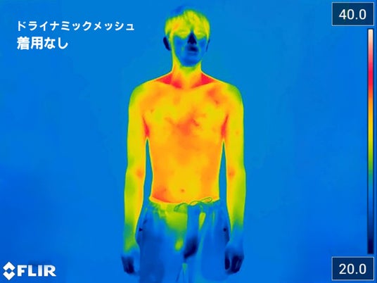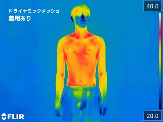 実際に氷点下の屋内スキー場にて、サーモグラフィーカメラを用いて測定した結果、同じ条件(シェル+ウールのベースレイヤー+ドライナミック メッシュ着用あり / なし)で、体表温度の違いが確認されました。ドライナミック メッシュの着用ありは、着用なしのものに比べて赤く色づいていることがわかります。