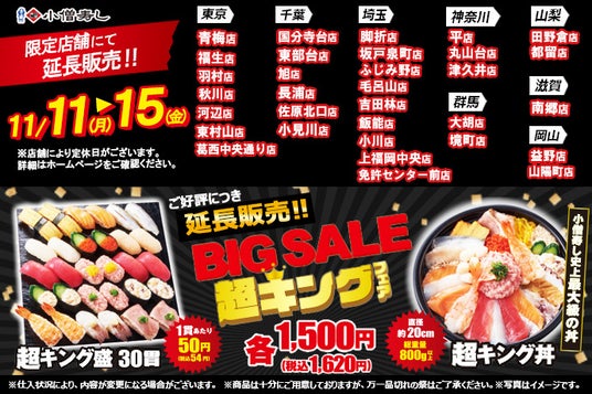 小僧寿しの新たな平日企画!「BIG SALE!『超キング』フェア」!大!大!大好評につき!11月11日(月)~延長販売決定しました!(限定販売にて開催します)