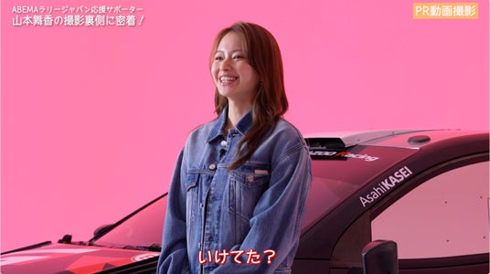 このたび公開された動画では、山本さんの「ABEMAラリージャパン応援サポーター」としての初仕事現場に密着しました。まずはキービジュアルの撮影からスタート。黒のラリーカーの横で、同じく黒色のレザージャケットとミニスカートを着用した山本さんが様々なポーズをとり、撮影は順調に進んでいきました。