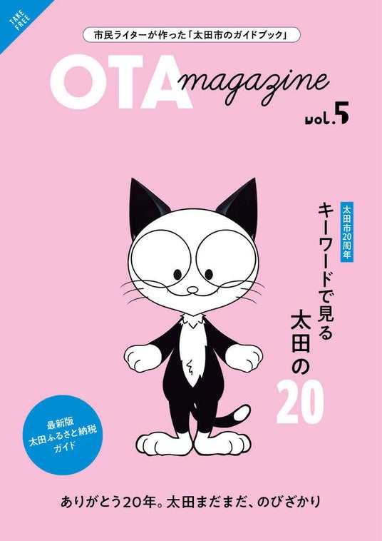 20周年を記念して誕生した新キャラクターNEOTAが表紙を務めました。モチーフは、江戸時代に新田岩松氏のお殿様が描いた「新田猫」。「NEO」(ギリシャ語で"新しい"の意味)と「OTA」をかけ合わせた名前のとおり、太田のこれからを盛り上げるべく、今後様々なシーンで活躍していきます。