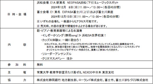 楽曲の誕生を記念して、E1A新東名高速道路(新東名) NEOPASA浜松(下り)、および、E1東名高速道路(東名)EXPASA富士川(上り)でお披露目会を開催します。静岡県で生まれ育った学生が、地元「しぞーか」への想いを込めた演奏を、ぜひお楽しみください。