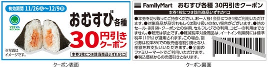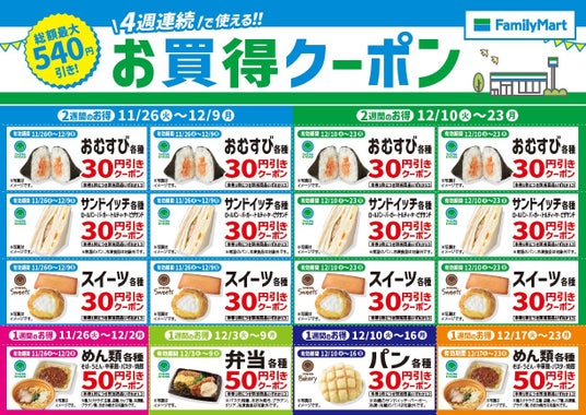 株式会社ファミリーマート(本社:東京都港区、代表取締役社長:細見研介)は、継続して取り組んでいる5つのキーワードの1つである「たのしいおトク」の一環として、おむすびやお弁当、サンドイッチ、スイーツなどご購入の際にご利用いただける「お買得クーポン」を2024年11月26日(火)から全国のファミリーマート約16,300店舗にて配布を開始いたします。