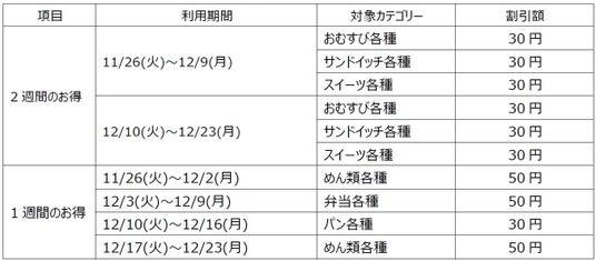 物価の高騰が続く昨今、多くのお客さまに楽しくおトクにお買い物を楽しんでいただきたいという思いから、おむすびやサンドイッチ、スイーツなどお買い求めいただく機会の多いカテゴリーを対象としております。