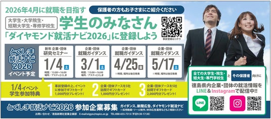 一般社団法人徳島新聞社(徳島市、理事社長 池上治徳)は、2026年春に徳島県内の企業・団体への就職を目指す学生や、彼らの採用を希望する企業・団体などを対象とした就職支援サービス「とくしま就活ナビ2026」を展開いたします。