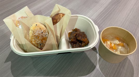 試食メニュー:クジラの竜田揚げ / 揚げパン / ABCスープ