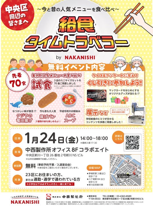 株式会社中西製作所(東証スタンダード:5941、本社:大阪市生野区、代表取締役社長:中西一真)は、学校給食の試食体験ができる無料イベント「~今と昔の人気メニューを食べ比べ~給食タイムトラベラー」を2025年1月24日(金)に開催いたします。