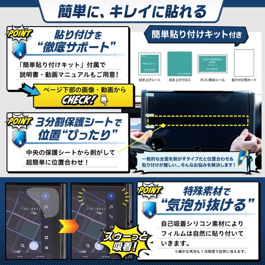3分割保護シートにより、大きなナビ画面でも位置合わせが簡単。