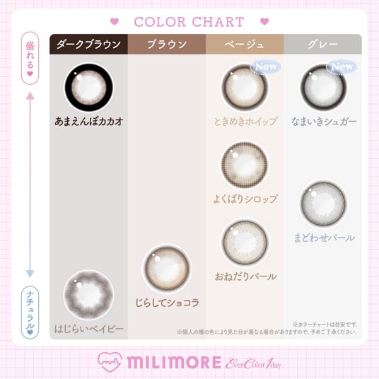 「エバーカラーワンデー」のDIA14.2mmシリーズ「エバーカラーワンデーミリモア」は、若年層を中心に「小さくても、しっかり盛れる」と人気のカラーコンタクトブランドです。今回、既存のカラー6色に加えて、もっとドーリーに盛れる新色2色を追加いたします。