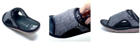 最も大きな特徴は、特許を取得した独自開発の構造により、履いた瞬間から気持ち良さを実感できる点です。立体構造のソールが足裏のアーチを支え、甲の内側に設けた伸縮バンドが足を締め付けることなくフィットします。スリッパにありがちなパカパカを軽減し、足に吸いつくような履き心地を実現。軽量かつしなやかで、軽快な歩行を促します。歩行解析デバイス「AYUMI EYE」 による一般的なスリッパ(当社比)との比較測定では、推進力・歩行速度・歩幅の向上が実証されました。