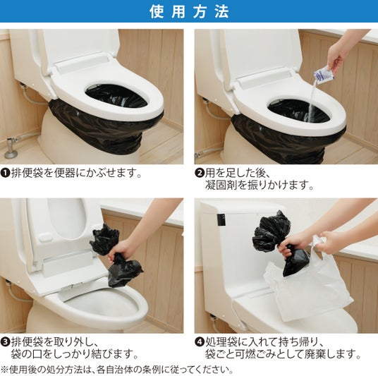 セット内容:(1個包装あたり)凝固剤1袋、排便袋(黒色)1枚、処理袋(白色)1枚