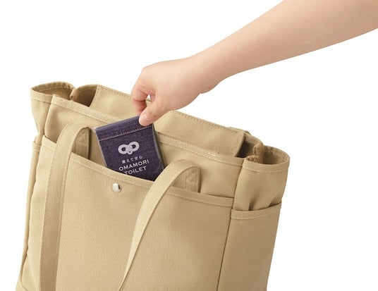 防災士監修の水も電気も必要なく、もしもの時に備えて持ち歩ける、手の平サイズの非常用携帯トイレです。