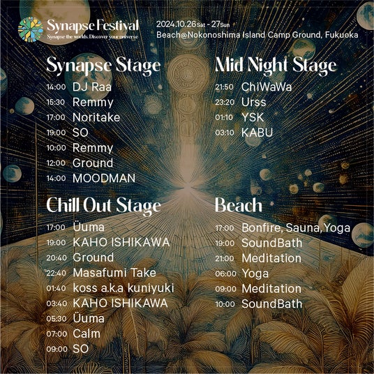 福岡県の能古島キャンプ場にて、2024年10月26日から27日までの2日間、野外フェスティバル『Synapse Festival』を開催いたします。