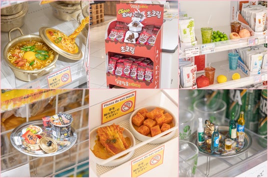 エモかわいいミニチュアサイズの模型や当店の人気商品の食べ方を再現した等身大の模型が陳列棚のあちらこちらに。パウチドリンクを氷カップに入れた模型や韓国で大人気のヨーグルト『ビヨット』を再現した模型、キムチやラーメン、マッコリなど店内のいろんな所にかわいい食品模型が飾られています。