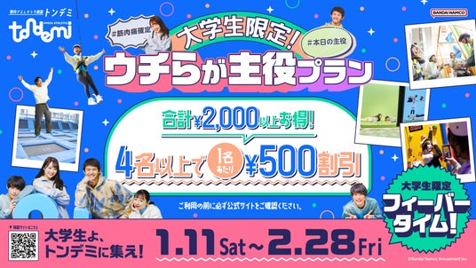 株式会社バンダイナムコアミューズメントは、屋内アスレチック施設『トンデミ』にて、2025年1月11日(土)から2月28日(金)の期間中、大学生(※1)4名以上でトンデミを利用すると1名あたり500円割引になる大学生限定「ウチらが主役プラン」(※2)を実施します。