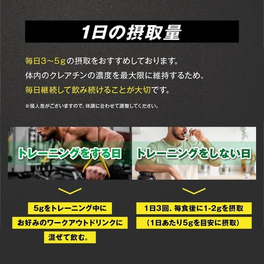・トレーニングをしない日:1日3回、毎食後に1‐2gを摂取(1日あたり5gを目安に摂取)