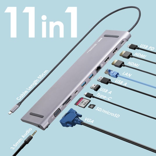 11 in 1の充実したポート数です。USB A×2、USB-C×1、HDMI×2、VGA×1、有線LAN、USB PD入力、SD/microSDカードスロット、3.5mmジャックを搭載しています。