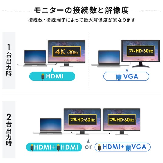 ディスプレイ1台出力時(HDMIのみ)は最大4K/30Hz(3840×2160)解像度に対応しています。2台接続時の最大解像度はそれぞれ最大フルHD(1920×1080)までサポートします。