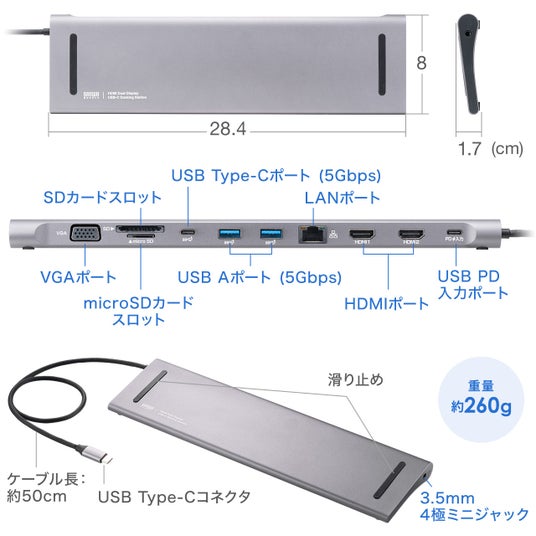 本製品のサイズはW28.4×D8×H1.7cm、 重量は260gです。