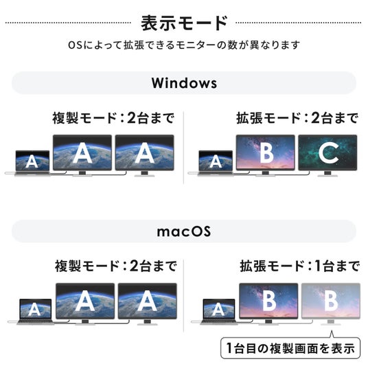 USB Type-C接続でのディスプレイ増設「DisplayPort Alt Mode」に対応するため、ソフトウェア/ドライバーのインストールなしで簡単にマルチディスプレイ環境(ミラーモード/拡張モード)を実現できます。