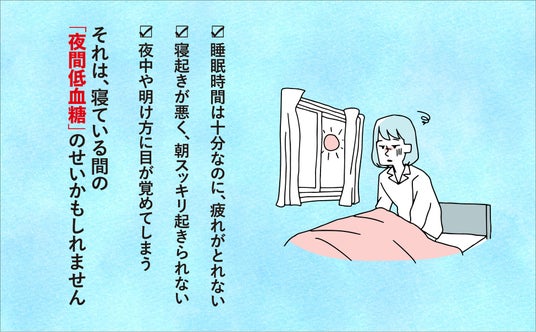 そう、「朝ダル」とは、睡眠によって疲れがとれていないのではなく、眠っている間に疲れを引き起こす「夜間低血糖」が起きていることが原因なのです。