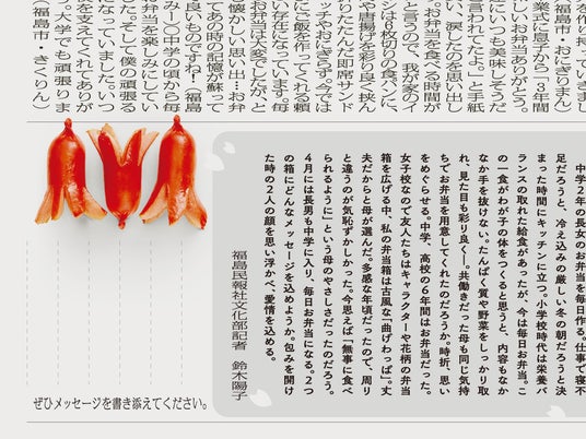 12月からあらかじめ保護者を中心にメッセージを募集し、紙面に掲載しています。保護者が毎日のお弁当づくりで込めていた想いや、知られざる裏話など、お弁当生活を締めくくる言葉が並びました。最後のお弁当をきっかけに、福島で過ごした記憶がこれからの人生を温めるものになれば、と願っています。