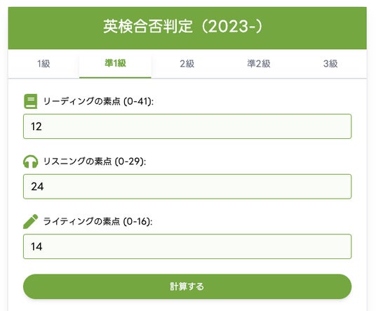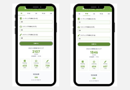スタディスタジオ株式会社(本社:東京都渋谷区、代表取締役:鈴木孝一、以下「当社」)は、既に公開済みの英検(R)2級以下(2級、準2級、3級)の旧形式対応に加え、新たに1級・準1級の旧形式にも対応した「合否判定ツール」を本日2025年1月25日にリリースいたしました。これにより、2023年度以前の過去問でも、リーディング・リスニング・ライティングの素点を入力するだけで、CSEスコアを換算し、合否の目安を確認できるようになります。