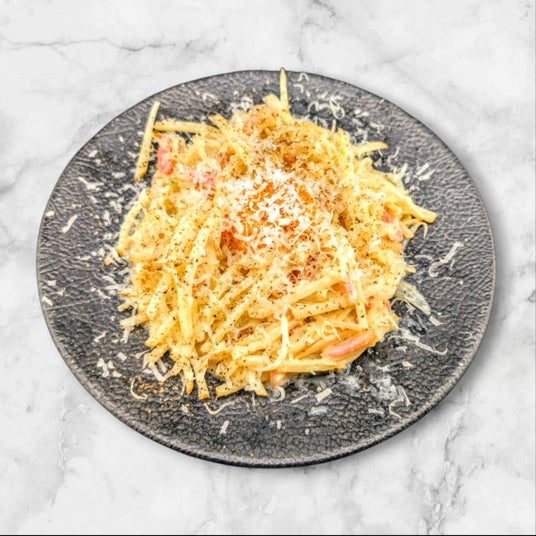 ジャガイモを細切りにして麺状にアレンジし、ベーコンとニンニクの香り豊かな特製クリームソースで味付けしました。仕上げにチーズ、卵、ブラックペッパーを混ぜることで、カルボナーラのような濃厚な味わいを実現。ジャガイモの食感とともに楽しめる、ユニークな一品です。
