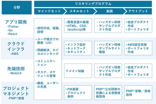 - 市場ニーズの高い「アプリ開発」、「クラウドインフラ」、「先端技術」及び「プロジェクトマネジメント」の4つの分野から、受講者の経験やスキル、キャリア志向等を踏まえ、リスキリングプログラムをGovTech東京と連携して提供します。